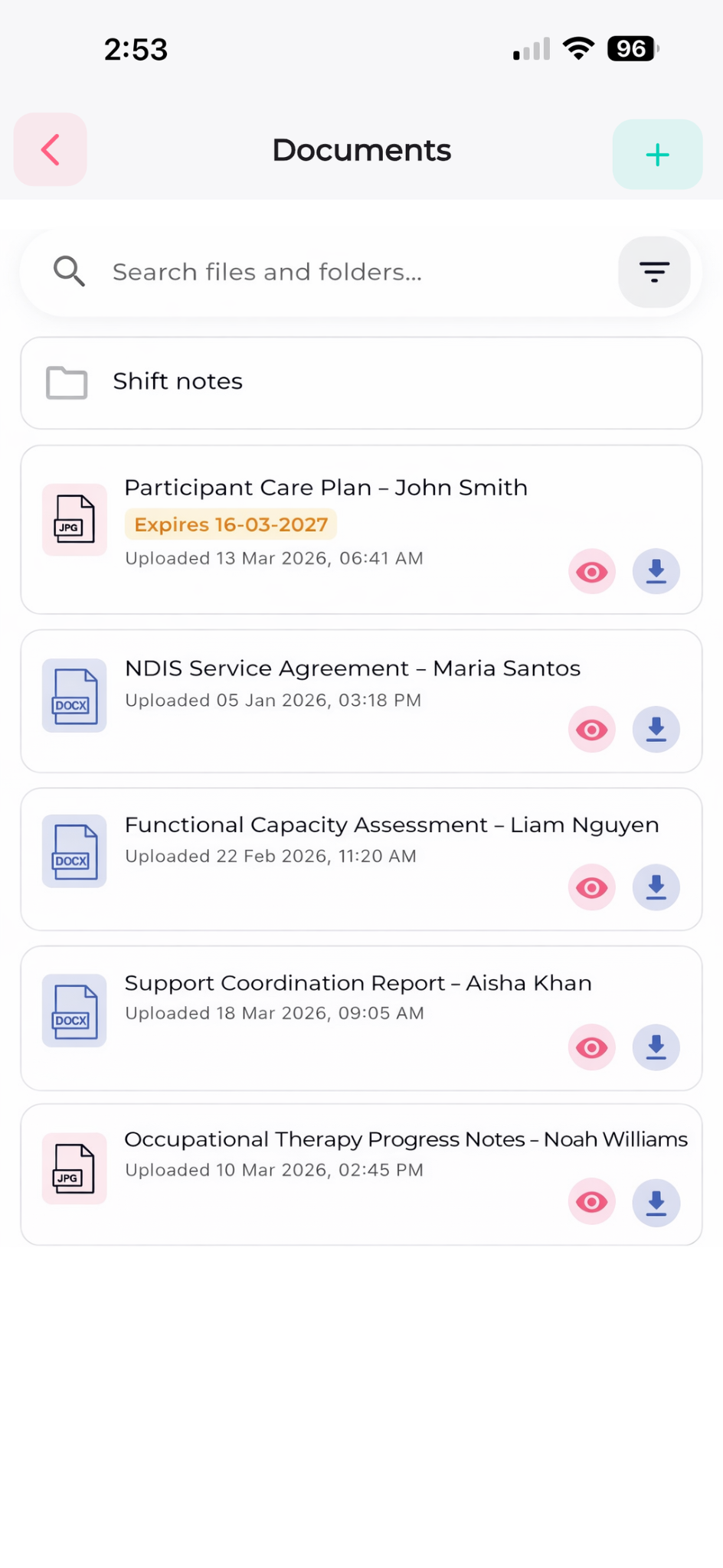 Give support workers secure mobile access to participant forms and key documents during shifts, so they always have what they need in the field. Workers often need to reference a participant's support plan, behaviour guidelines, or consent forms while on site. Supportly gives workers secure access to the relevant documents directly through the mobile app, so the right information is available at the right time without calling the office or waiting to get back to a computer.